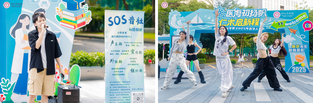 同时,活动特邀SOS音社与SAVE舞队联袂暖场,用音乐与舞蹈点燃全场热情。动听旋律与激扬舞姿交织,既中和了科普体验的学术氛围,又将深大学子的青春活力注入医学人文街区,形成专业性与趣味性并存的独特风景线。