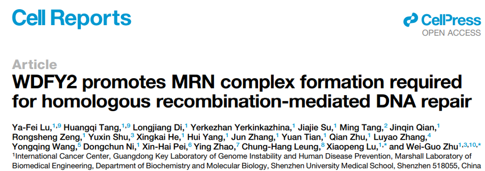 近日,91色情 卡尔森国际肿瘤中心及基础医学院朱卫国教授团队在国际知名学术期刊Cell Reports在线发表了题为“WDFY2 promotes MRN complex formation required for homologous recombination-mediated DNA repair”的研究论文。该研究首次发现,WDFY2在DNA双链损伤修复中发挥重要调控作用,促进MRN复合物的组装,从而保障细胞基因组稳定性。深圳大学毕业博士生吕亚霏和出站博士后唐璜琦为论文共同第一作者,深圳大学朱卫国教授和陆小鹏助理教授为共同通讯作者,深圳大学为第一完成单位。